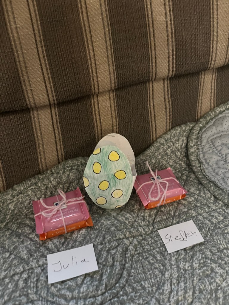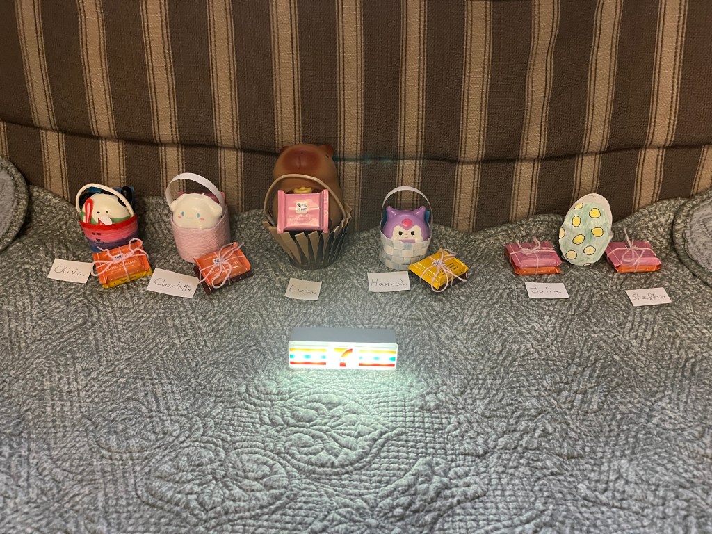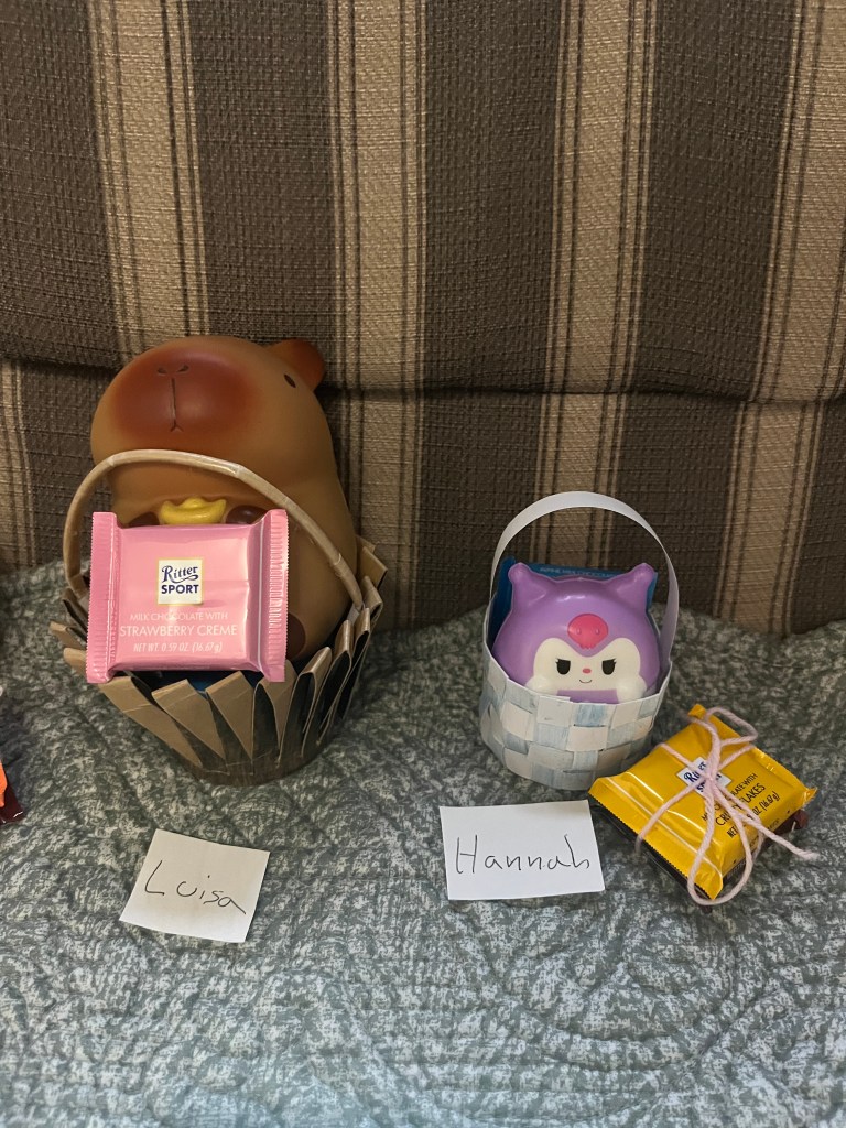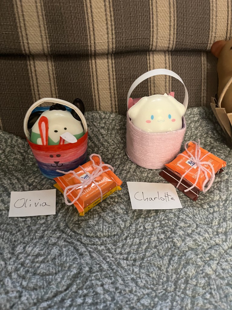The next day we had a small belated Easter celebration with these adorable baskets that Olivia crafted filled with a few goodies Charlotte and I found in the Hong Kong airport during our layover. A group effort!
