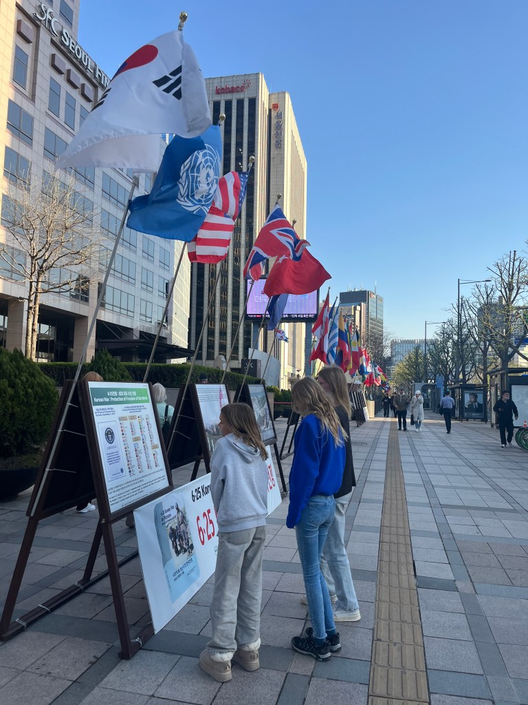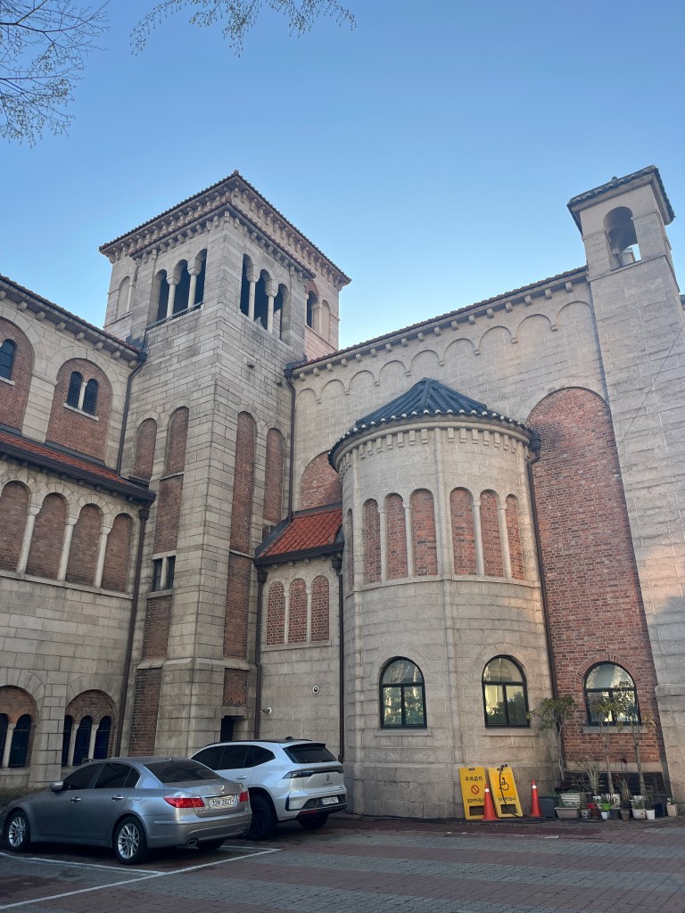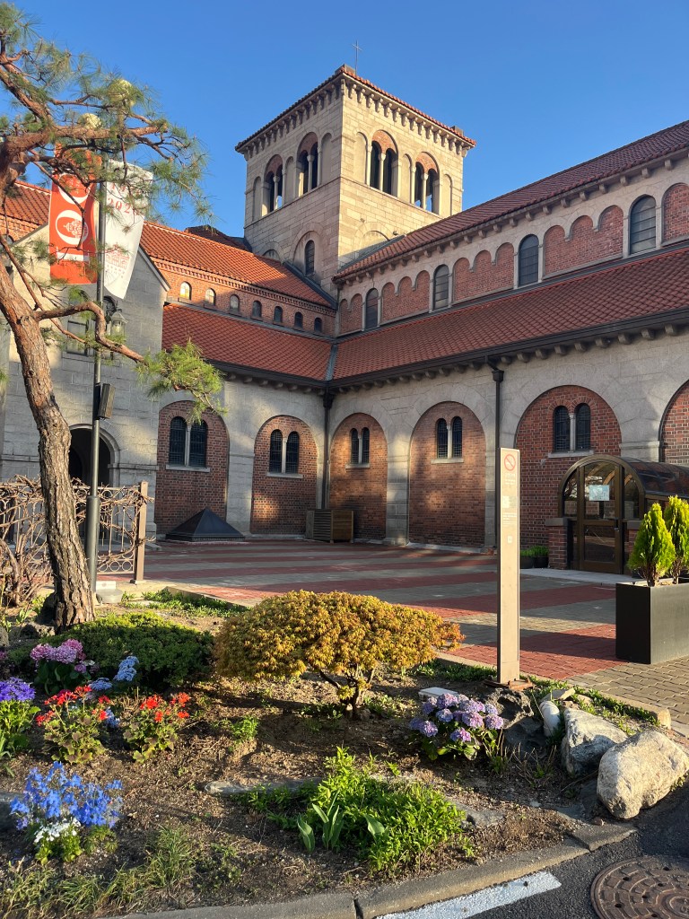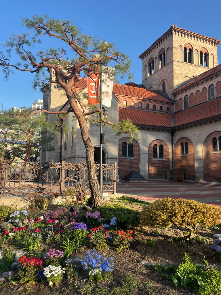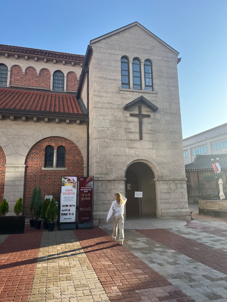 Then we just wandered for a while. A few things we noticed: they had speakers on the street playing the new BTS album which was fun. Also, there was an exhibit on the street about the outbreak of the Korean War on June 25 1950. And we stumbled upon a cathedral amongst the temples. A lovely afternoon exploring, though we were sad that Olivia was still sick. She felt good enough to venture out to dinner that evening, which was great, since we had a big day planned for the next day.